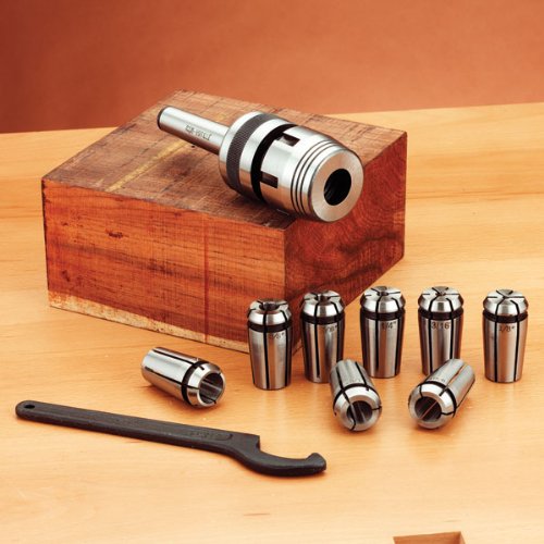 Collet chucks are preferred by woodturners for holding small pieces for turning because the collets grip tight enough to easily hold your work but with little or no marring. Our chuck is built to machinist tolerances and uses interchangeable collets to grip round tenons. The collets, which work just like the chuck in your router, grip with even pressure completely around the tenon on your workpiece. Includes eight collets which range from 1/8" to 3/8" and 1/2" to 5/8" by 16ths, collet chuck with #2 Morse taper and chuck wrench in a fitted case.This website is a participant in the Amazon Services LLC Associates Program, an affiliate advertising program designed to provide a means for sites to earn advertising fees by advertising and linking to amazon.com